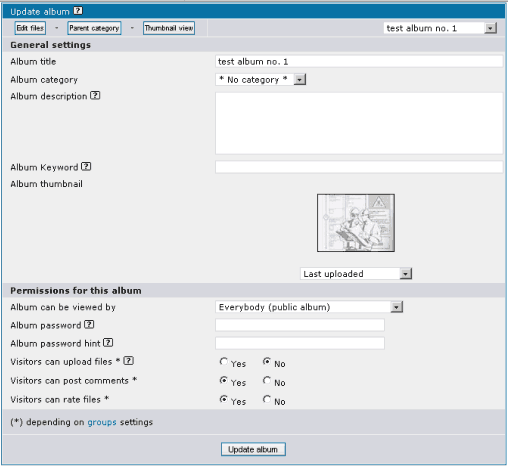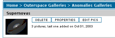 There is, however, a special category named "User galleries". This category can't be deleted. If a user belongs to the group "can have a personal gallery" and this is set to YES, he will have the right to create his own albums and his gallery will be a sub-category of "User galleries". This link is not visible to visitors of your site, however, if you do not allow users to upload pics and have their own albums.