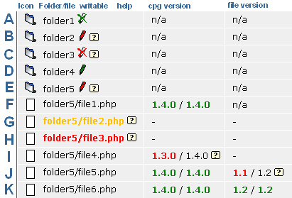 The column "file version" holds the individual file's version that get's increased during development of a new coppermine version (each time a developer modifies a certain file, the version number increases by one). As folders can't contain such version numbers, they are again labelled as "n/a" (rows "A" to "E"); the same applies to files that don't exist, that's why their file version is displayed as dash (rows "G" and "H"). Also the file version is irrelevant when comparing files from different coppermine packages, that's why row "I" has a dash as well.