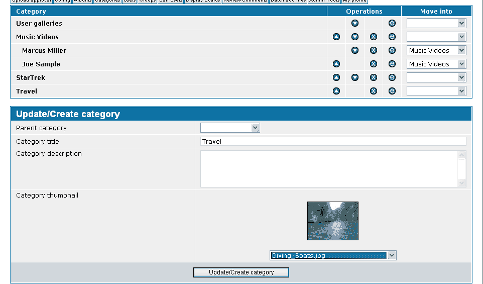 There is, however, a special category named "User galleries". This category can't be deleted. If a user belongs to the group "can have a personal gallery" and this is set to YES, he will have the right to create his own albums and his gallery will be a sub-category of "User galleries". This link is not visible to visitors of your site, however, if you do not allow users to upload pics and have their own albums.