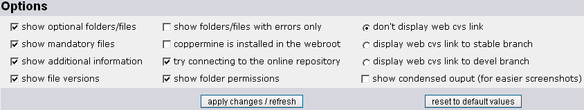 The options screen lets you configure the versioncheck, or rather what is being displayed. The options aren't saved anywhere, so you will have to adjust them each time you run versioncheck. The default options should be OK for most users - only change them if you have good reasons to do so.